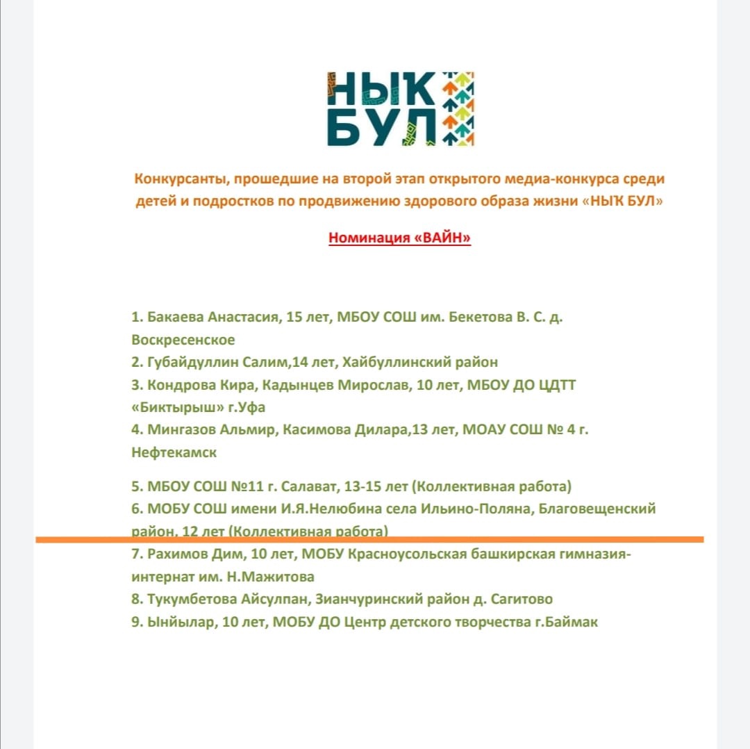 Команда учащихся нашей школы успешно прошла НА ВТОРОЙ ЭТАП ОТКРЫТОГО МЕДИА-КОНКУРСА СРЕДИ ДЕТЕЙ И ПОДРОСТКОВ ПО ПРОДВИЖЕНИЮ ЗДОРОВОГО ОБРАЗА ЖИЗНИ «НЫҠ БУЛ».