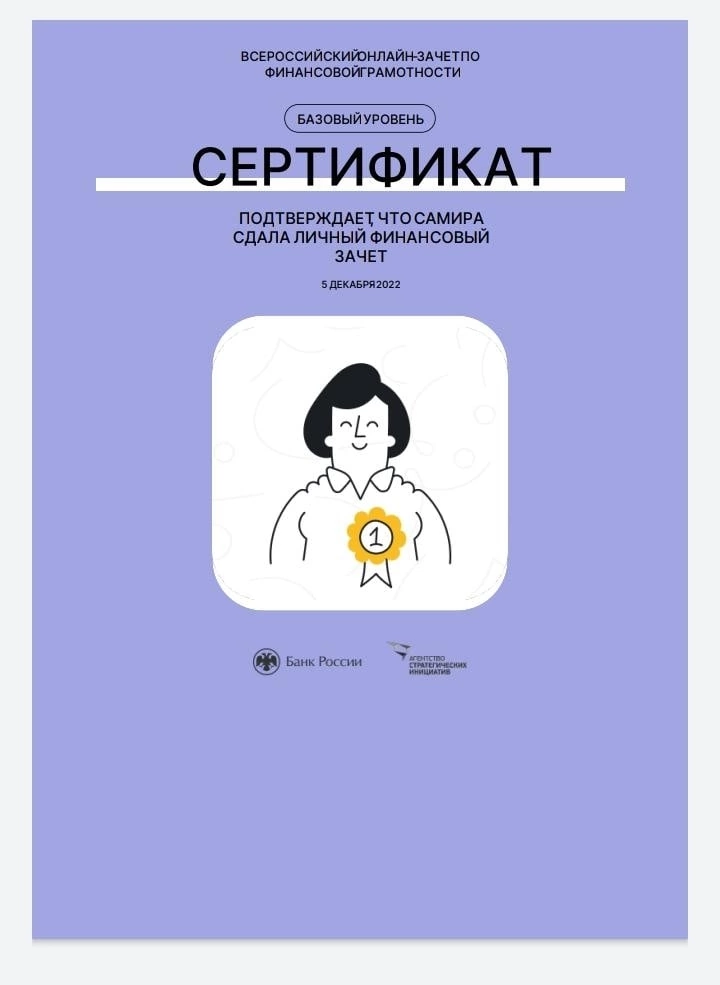 Наша школа принимает участие во Всероссийском онлайн-зачёте по финансовой грамотности, который проходит с 1 по 15 декабря. Проверить свою осведомленность в финансовых вопросах может любой желающий на сайте проекта: https://finzachet.ru/. Как пояснили в пресс-службе Нацбанка Башкирии, в зачете два уровня сложности. Базовый – для тех, кто только начинает разбираться в финансах и хочет быть уверен, что правильно понимает основы грамотного финансового поведения. Продвинутый – для тех, кто имеет опыт использования разных финансовых продуктов и услуг и готов к сложным вопросам.