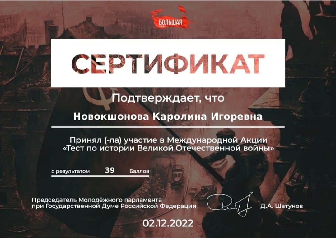 - Учащиеся нашей школы посмотрели документальный фильм Молодежного парламента «Неизвестный солдат» в рамках действия ФЗ «О защите детей от информации, причиняющей вред их здоровью и развитию». После просмотра перешли к обсуждению в формате открытого диалога. Также, сегодня в преддверии Дня Неизвестного Солдата учителя и учащиеся нашей школы активно проходят тест по истории Великой Отечественной войны. Участником этой акции может стать любой желающий, пройдя по ссылке big-history.ru. Тестирование будет доступно сутки 2 декабря 2022 года с 00:00 до 23:59. Без вести пропавший – еще не значит растворившийся во тьме истории. Погибшие воины живы в народной памяти, которая бережно хранится и передается от поколения к поколению. Лозунг "Никто не забыт, ничто не забыто" стал символом Дня неизвестного солдата. Вечная память отдавшим жизнь за свободу нашего Отечества!